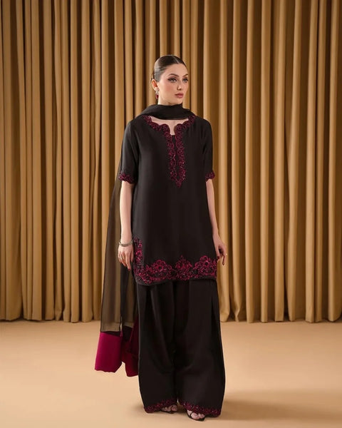 This exquisite 3-piece stitched ensemble is a perfect blend of elegance and tradition. The Black π¦πππ π’π’πSILK shirt features delicate embroidery with intricate Resham thread work, enhanced by a stunning array of pearls, sequins, crystals, and katdana, beautifully scattered across the shirt, sleeves, and borders. The shirt is paired with a matching Raw Silk pant trouser, offering a refined and graceful silhouette. Completing the look is a luxurious Pure Organza dupatta, adorned with a finely detailed border, adding a touch of sophistication and charm to the entire ensemble. Perfect for any special occasion, this outfit exudes timeless beauty and craftsmanship