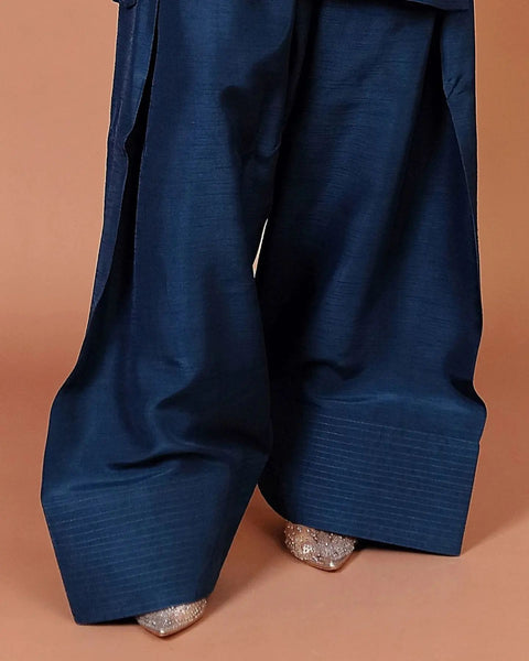 navy-blue outfit, featuring a classic silhouette and a soft,