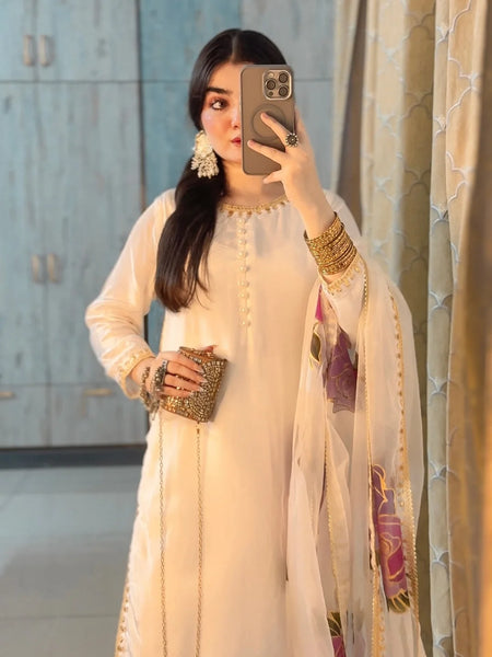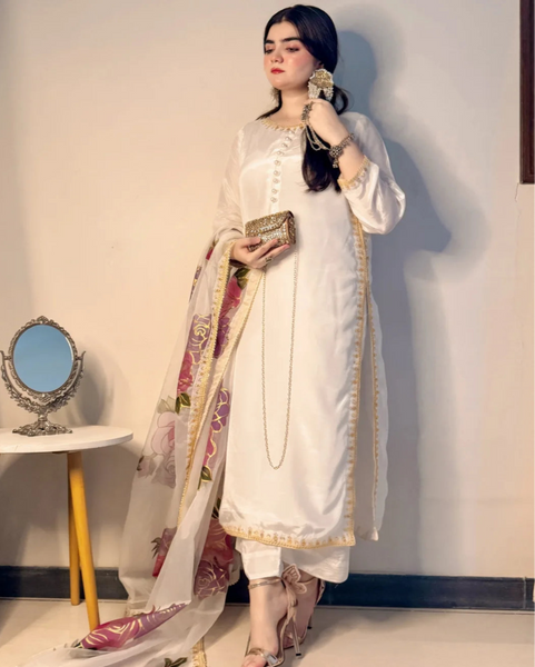 Its 3-piece premium Indian raw silk Embroidery work shirt and trouser with daimond organza Hand painted and embroidered work dupatta as well,Available in both options :Stitched ,Unstitched ,A graceful ensemble featuring an embroidered silk shirt, plain trouser with pearl cut detailing, and a vibrant floral embroidered printed dupattaExchange Policy: 7 DaysFor any queries or to get in touch,INBOX US FOR QUERIES OR WHATSAPP ON..03091799500💯Authentic ProductsSuper Customer ServiceWorld wide shipping