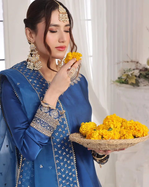 A premium 4 piece kataan silk set with embroidered shirt, embroidered trouser and an embroidered diamond organza dupatta. Comes with an attal inner for a neat, comfortable finish. A refined pick for any formal event.