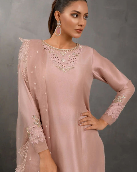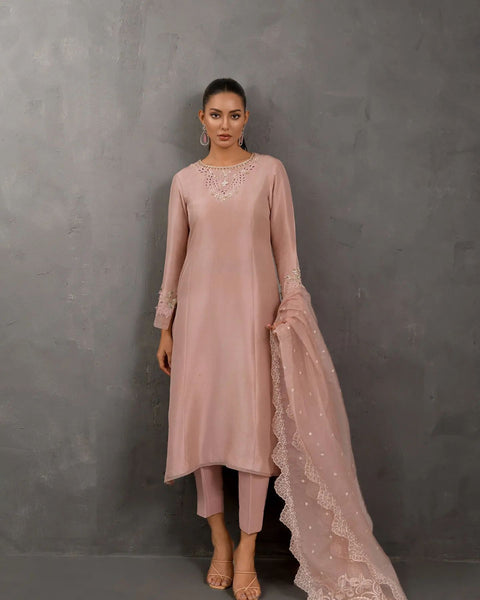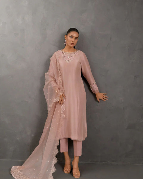 This sophisticated ensemble is crafted from luxurious silk in a soft blush pink shade. The shirt is detailed with delicate embroidery around the neckline, offering a refined and subtle elegance. Complementing the silk is a sheer organza dupatta, beautifully adorned with intricate floral embroidery on the borders and delicate motifs scattered across, enhancing its graceful appeal. Paired with slim-cut pants, this outfit is perfect for formal and semi-formal events, combining modern elegance with classic charm.