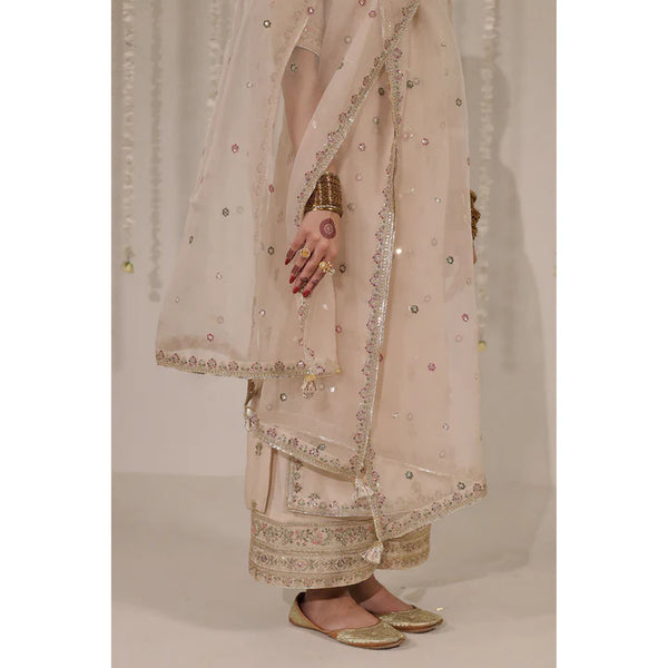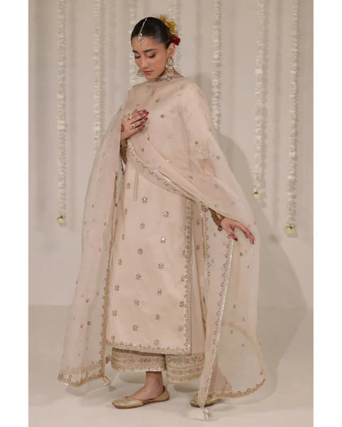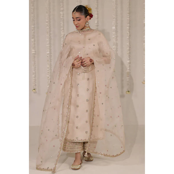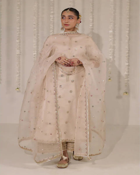 Grace meets sophistication in Noor e Zar , a 3-piece lawn ensemble designed for timeless celebrations. The shirt is crafted in a soft champagne tone with intricate mirror-style embroidery scattered across the front, creating a glistening yet graceful look. The sheer organza dupatta features detailed edging and scattered motifs, adding a hint of luxury to the airy silhouette. Perfect for summer weddings, Eid events, or intimate gatherings — this outfit brings elegance to life, effortlessly.