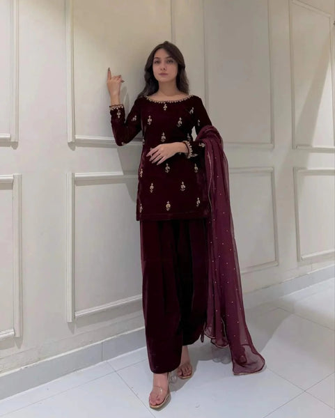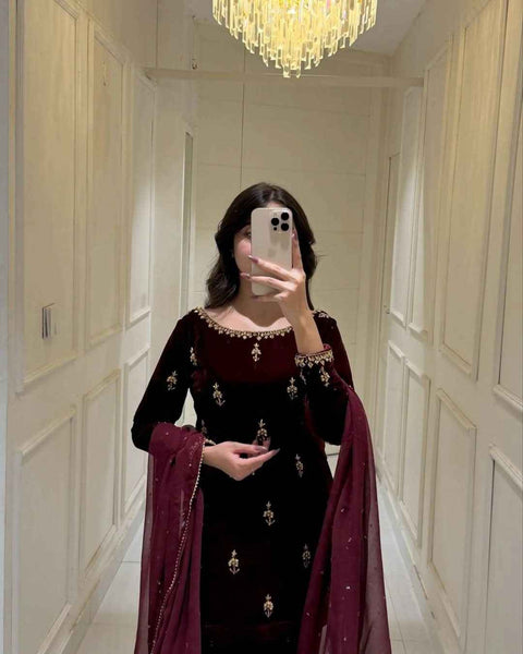 It's unstitched/Stitched 3pc Velvet embroidery work dress with Chiffon as well