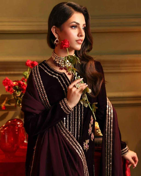 Its Unstitched/Stitched 3-piece premium Velvet, tilla sequence & embroidery work dress with Chiffon tilla sequence & embroidery work dupatta as well