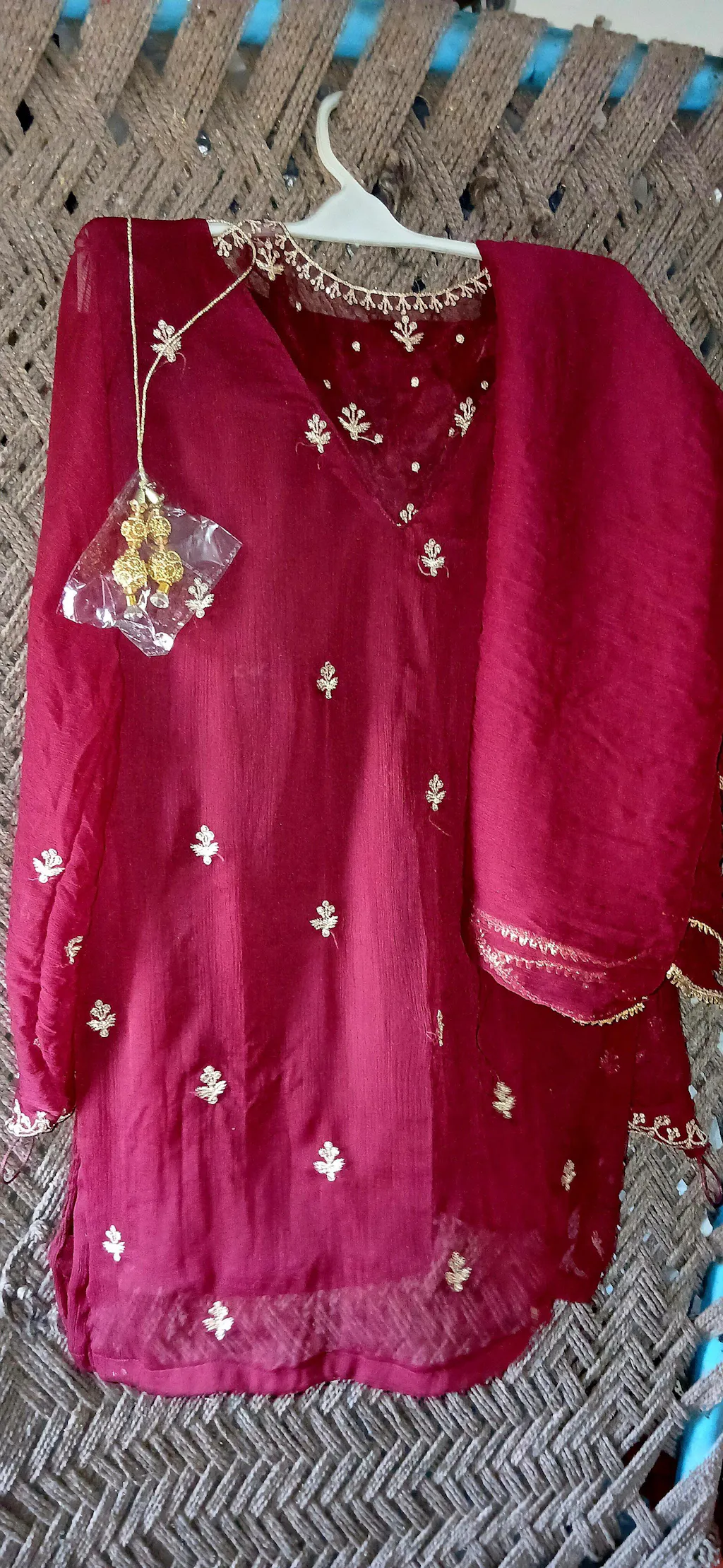 Mehro A 4-piece embroidered chiffon suit with matching trouser, chiffon dupatta and inner. Light, soft and elegant for any occasion.